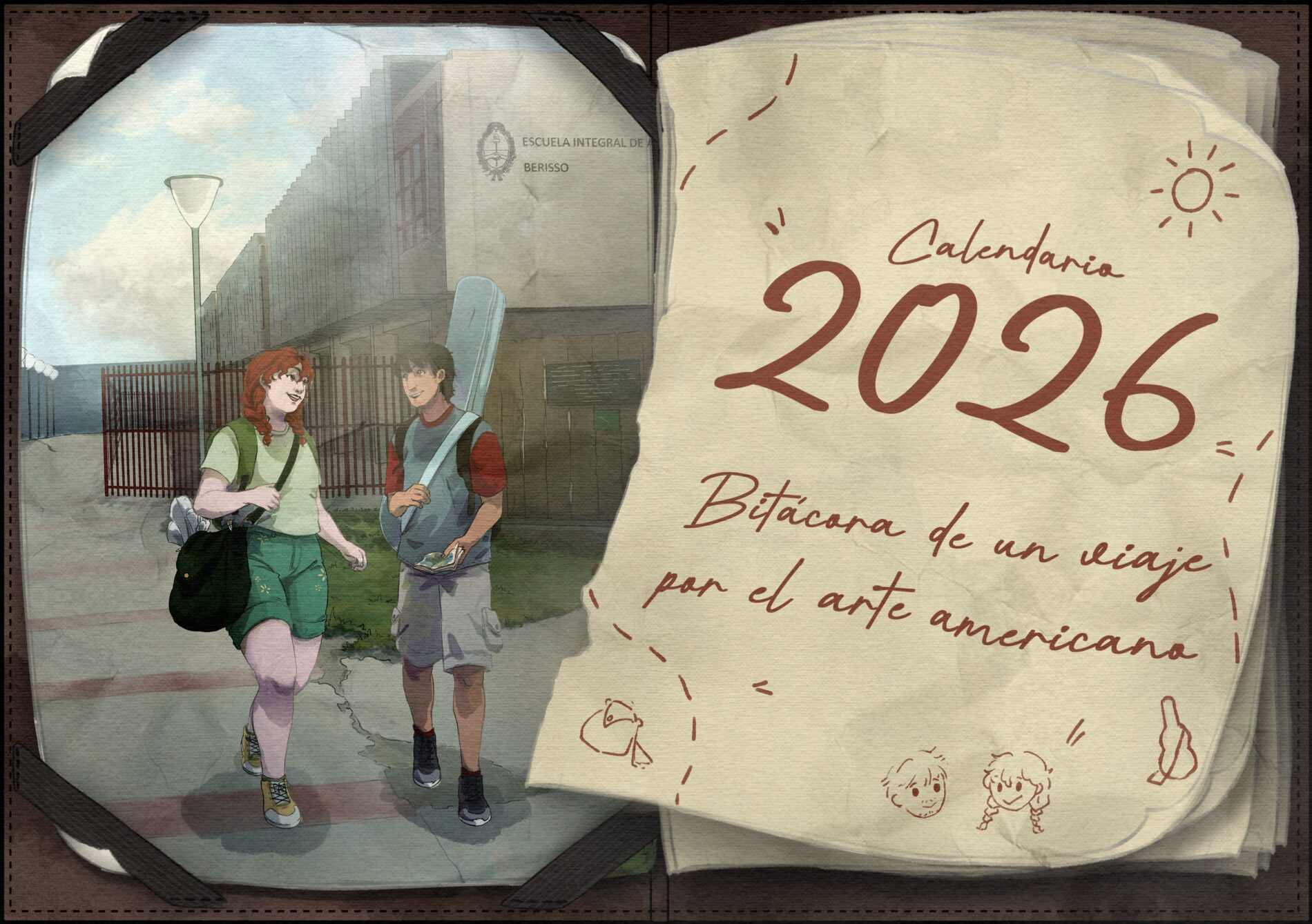 En su 14° edición, el Calendario Interdisciplinario 2026 de la Escuela de Arte de Berisso presenta Bitácora de un viaje por el arte americano, un relato ficcional protagonizado por dos graduados de la Escuela de Arte, que nos adentra en la heterogeneidad del territorio americano desde una mirada decolonial atenta a la diversidad y al mestizaje cultural.