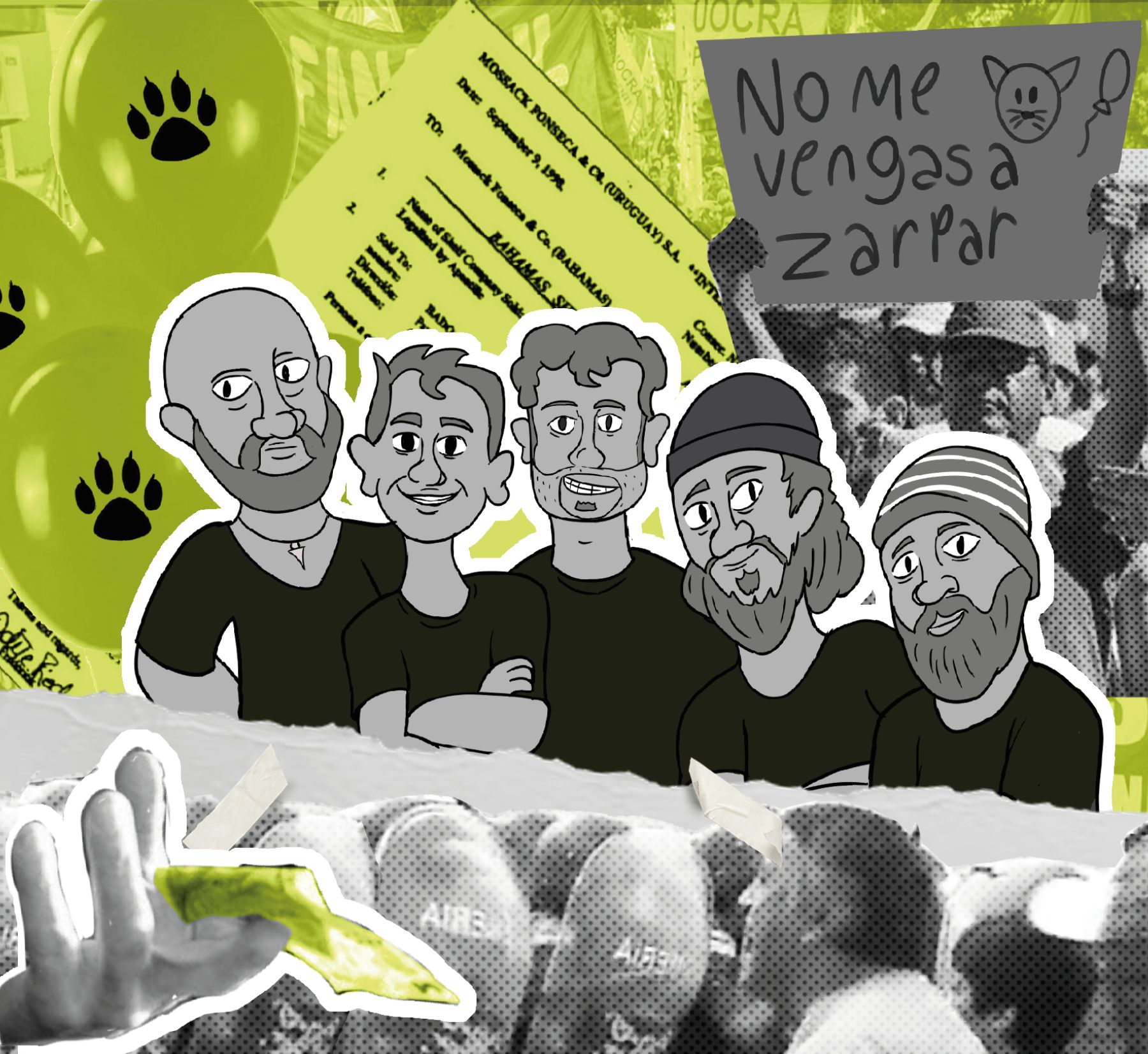 Para la creación de esta ilustración, investigué sobre la situación de Argentina antes del lanzamiento de la canción. Indagué acerca de acontecimientos vinculados al gobierno de ese entonces, fábricas e industrias cerradas y seleccioné las imágenes relevadas en esa investigación para el collage. Utilicé fotografías sobre la marcha en contra del cierre de la planta Fanazul, de la represión hacia los trabajadores de la empresa avícola Cresta Roja y del caso de los Panamá Papers.