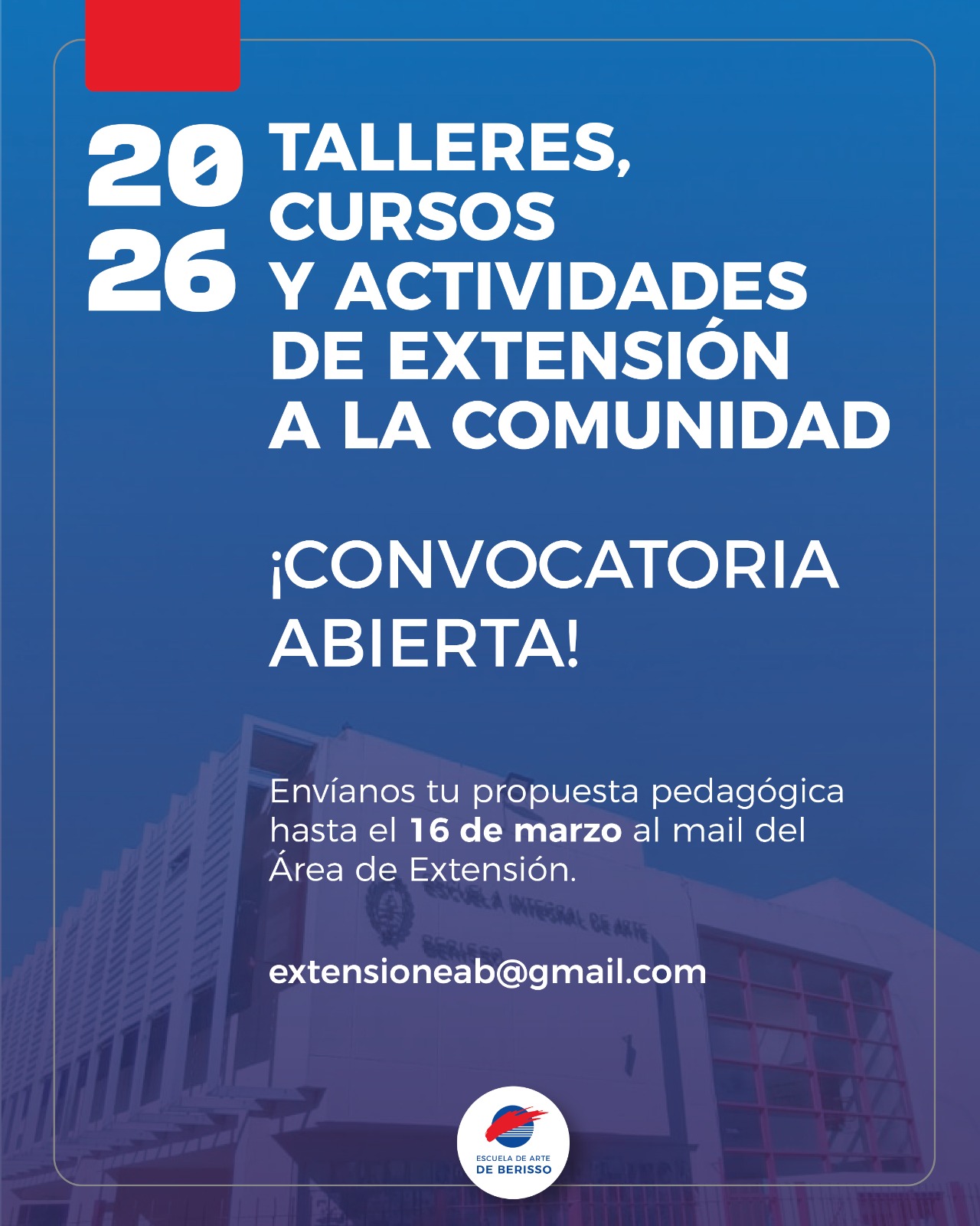 Desde la Escuela de Arte de Berisso abrimos la convocatoria para la presentación de proyectos destinados a nuestra comunidad. Invitamos a docentes, artistas y profesionales de la cultura a formar parte de nuestra propuesta académica del ciclo 2026.
